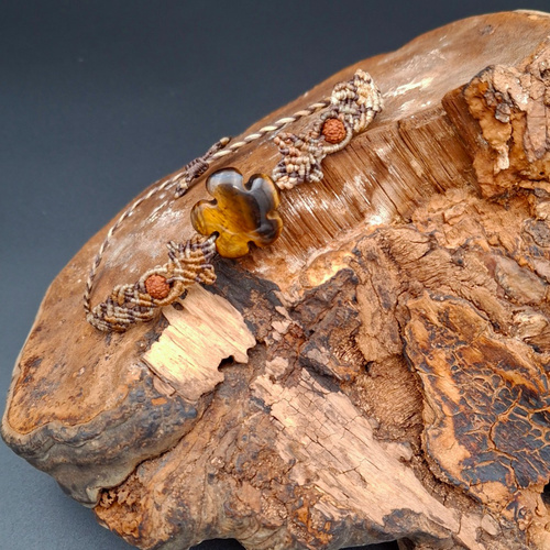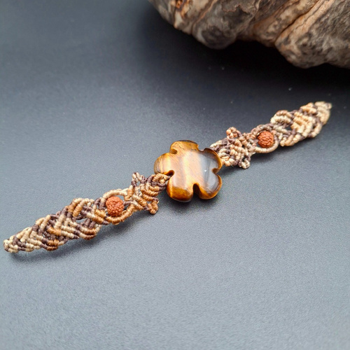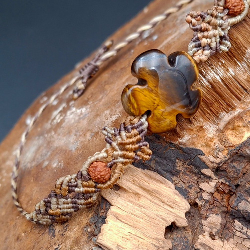 این دستبند با تکنیک ظریف میکرومکرومه بافته شده و در مرکز آن سنگ چشم ببر و کنار آن دانه رودراگشا قرار دارد؛ سنگی که از گذشته به عنوان نماد قدرت، شجاعت و اعتمادبهنفس شناخته میشود.
